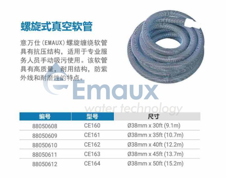競技池意萬仕(EMAUX)螺旋纏繞軟管具有抗壓結(jié)構(gòu),適用于專業(yè)服務(wù)人員手動吸污使用。該軟管具有高質(zhì)量,耐用結(jié)構(gòu),防紫外線和耐磨性的特點。